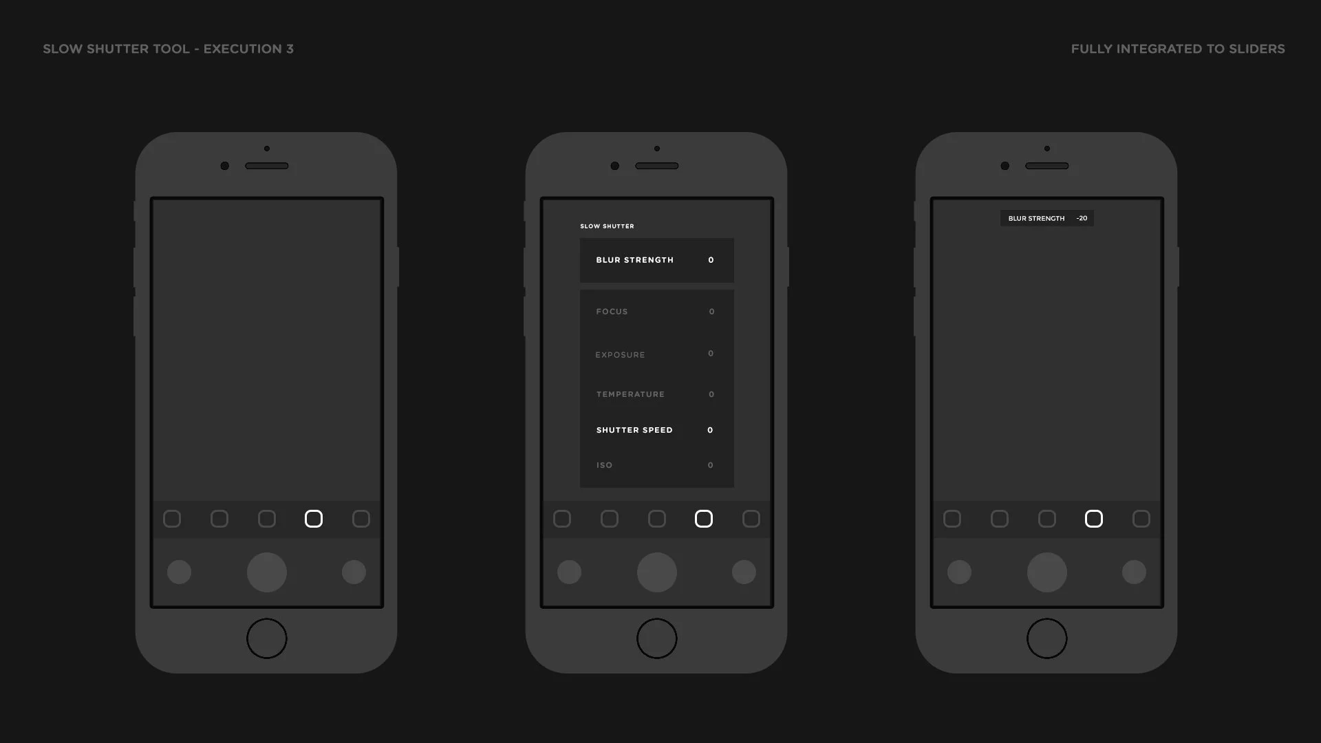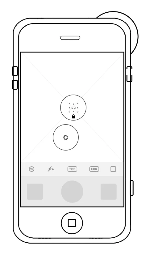 Utilizing learnings from my customer research I began my wireframe and rapid-prototyping phase. The objective here was to understand how best I could optimize the layout of a camera app. Keeping true to my initial project goal I wanted the app to be sleek, but not sacrifice key features and the simple functionality that users desired. What came about from this exercise was a new and rapid way for users to make fine camera adjustments all while maintaining focus on their subject.
